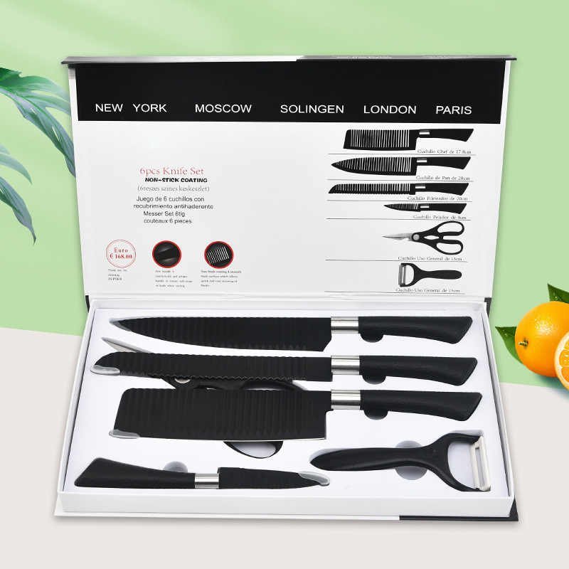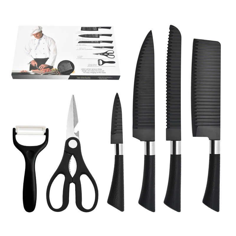 ✨ ৬ পিস কিচেন নাইফ সেট – নন-স্টিক কোটিং শেফ নাইফ, কাঁচি ও সিরামিক পিলার